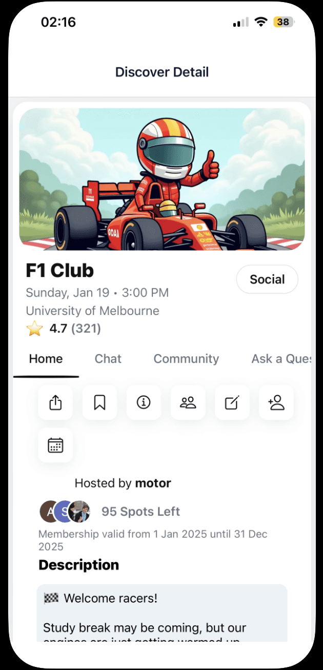 Whether you’re new or need info fast, ask questions directly to club leaders or peers — no more waiting or guessing.